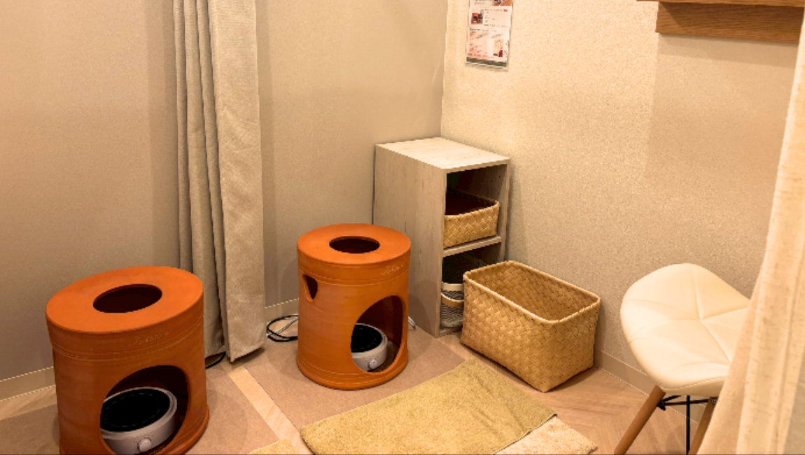 黄土を素焼きした椅子は、遠赤外線が出るとされ、身体の表面だけでなく内側から温まる感覚を大切にしています。